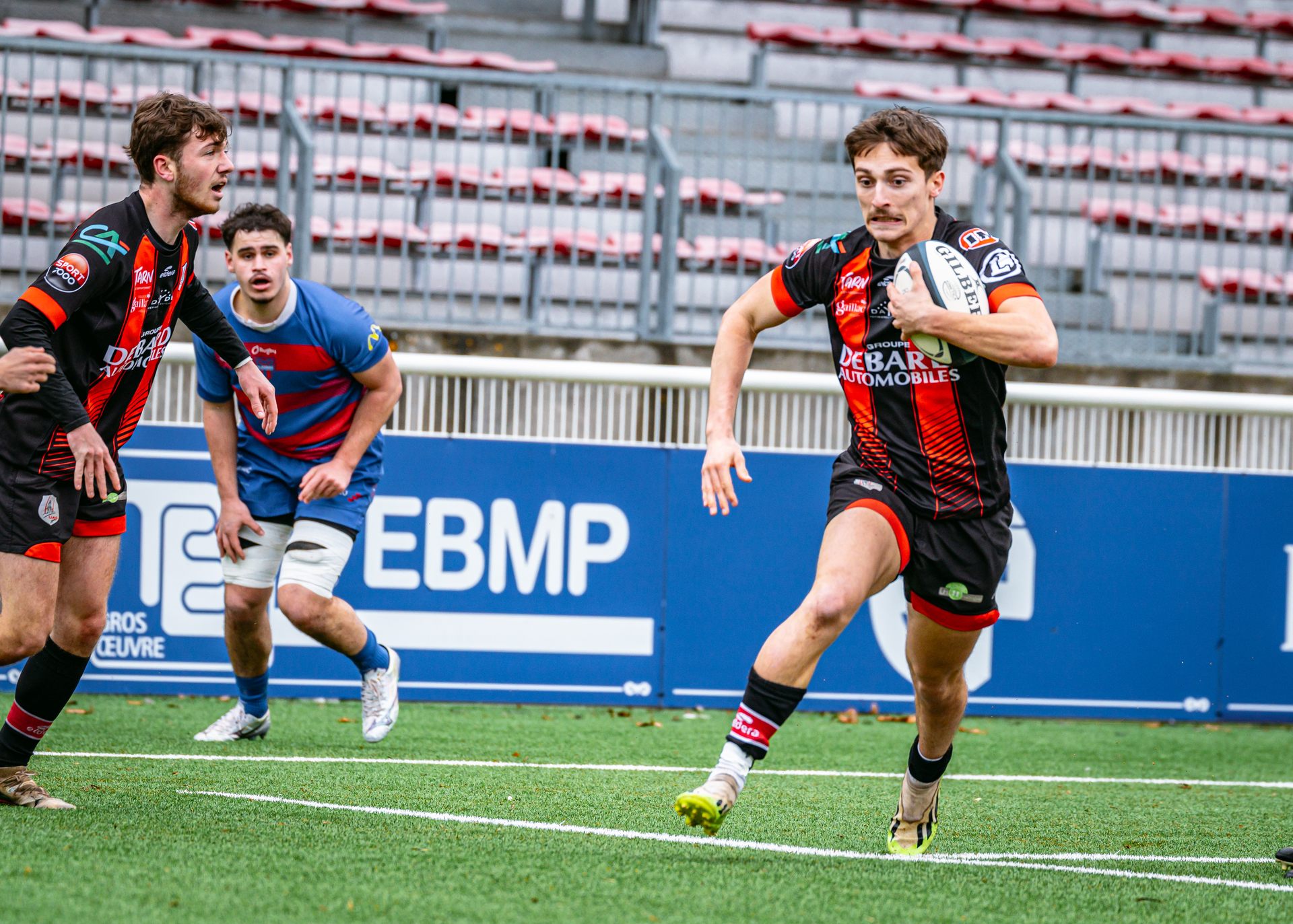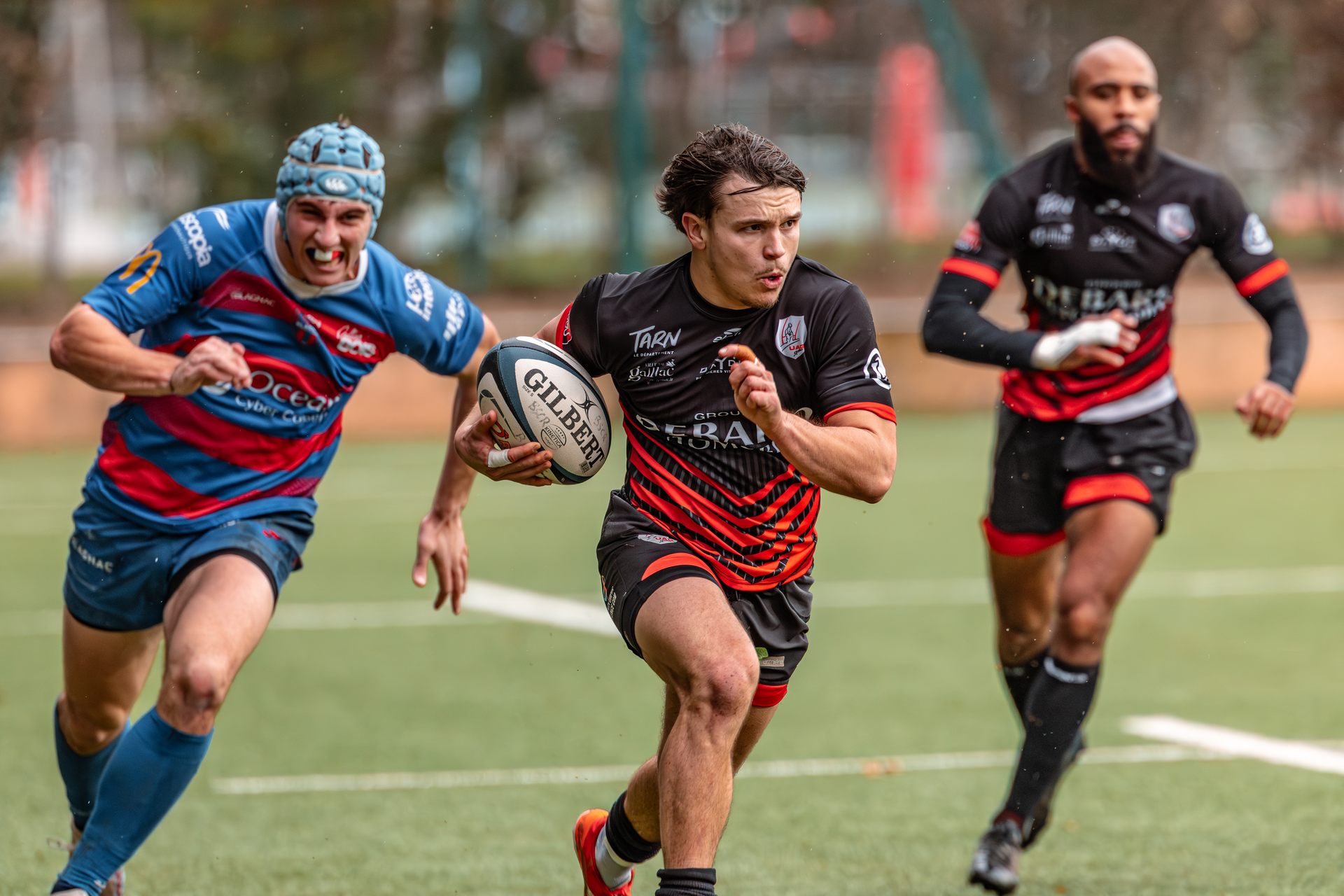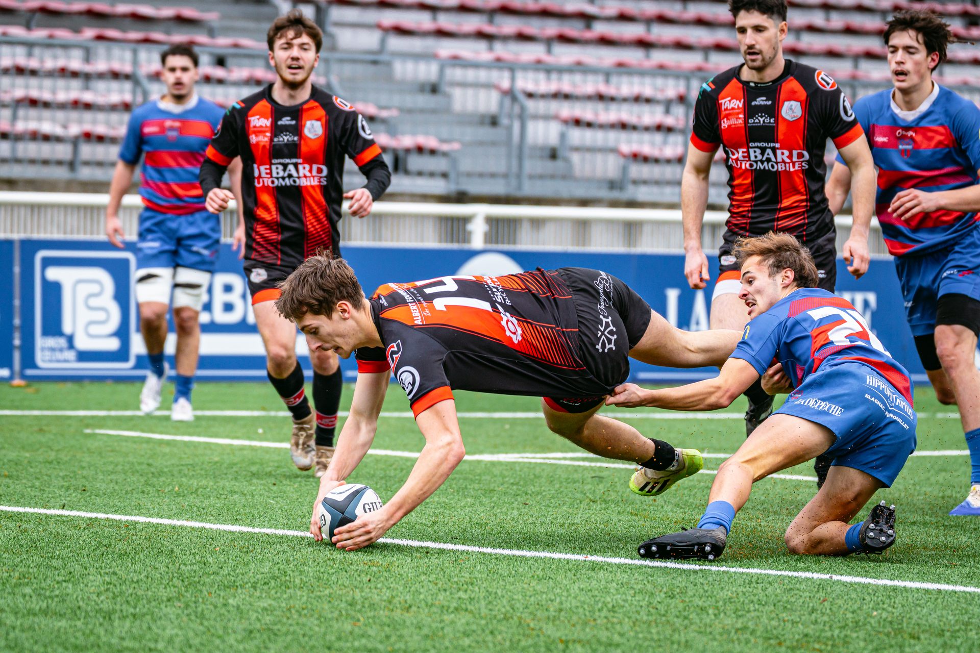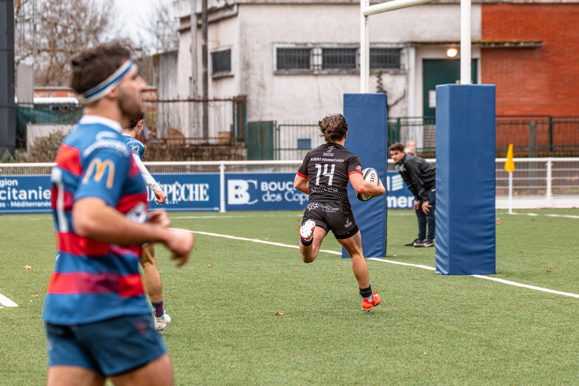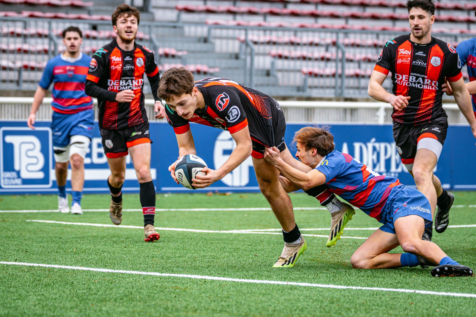 La réaction gaillacoise est immédiate. Sur un ballon de récupération, Tilian Escaffit transperce la défense et file le long de la touche pour égaliser (7-7, 21’).
