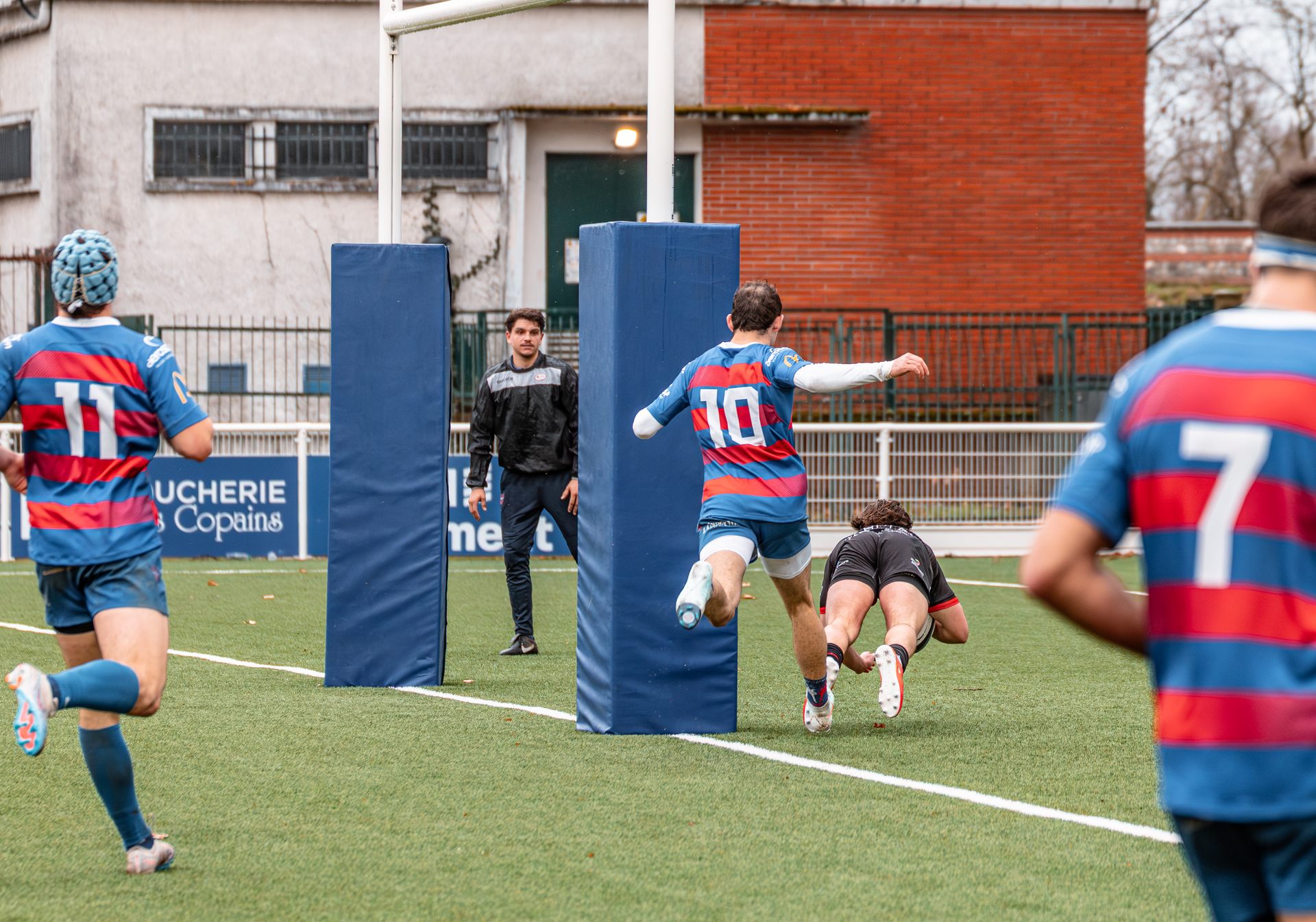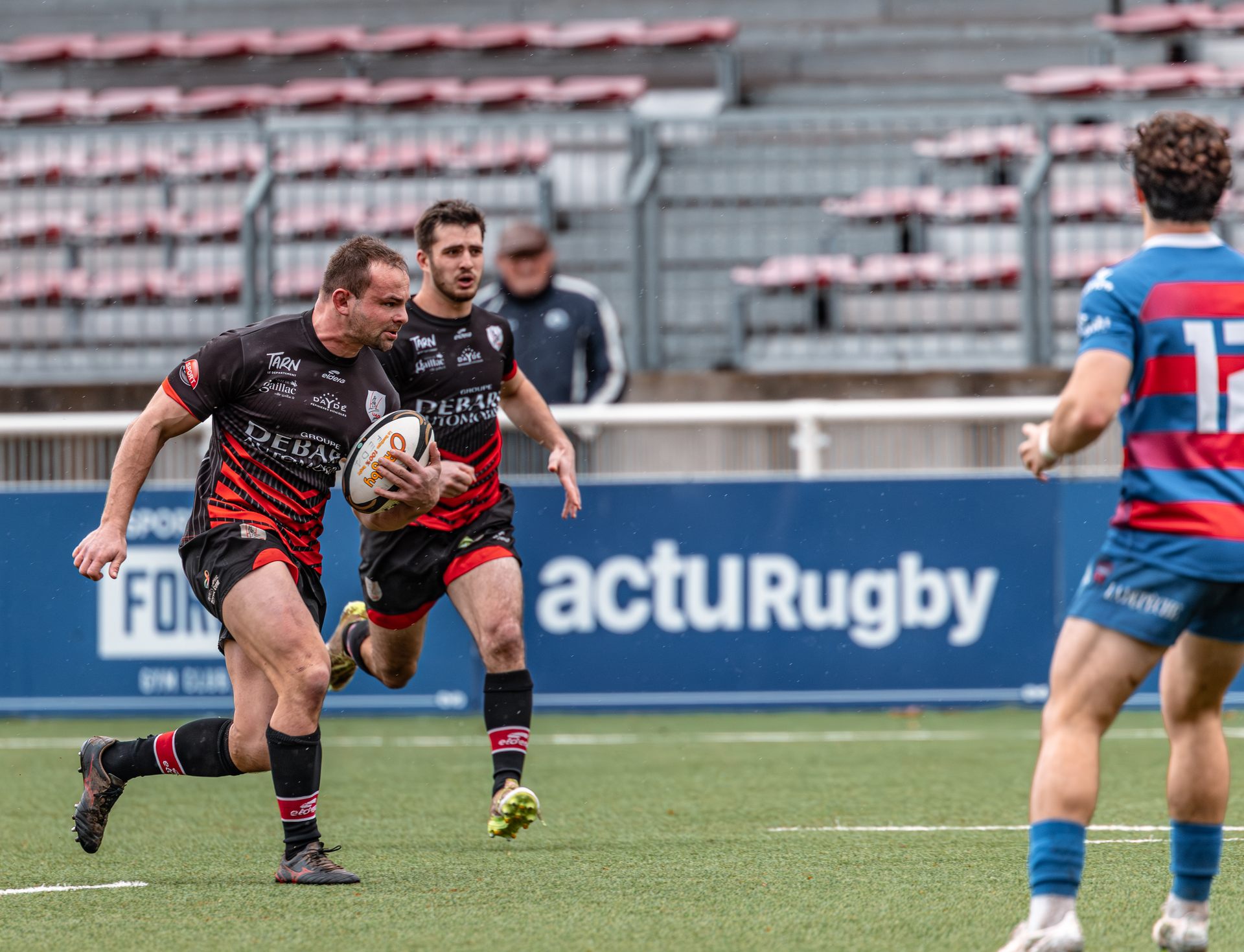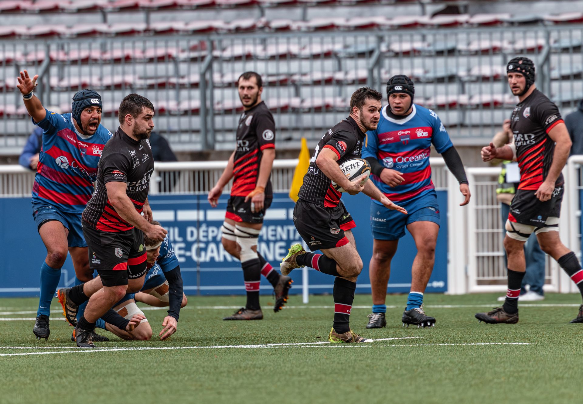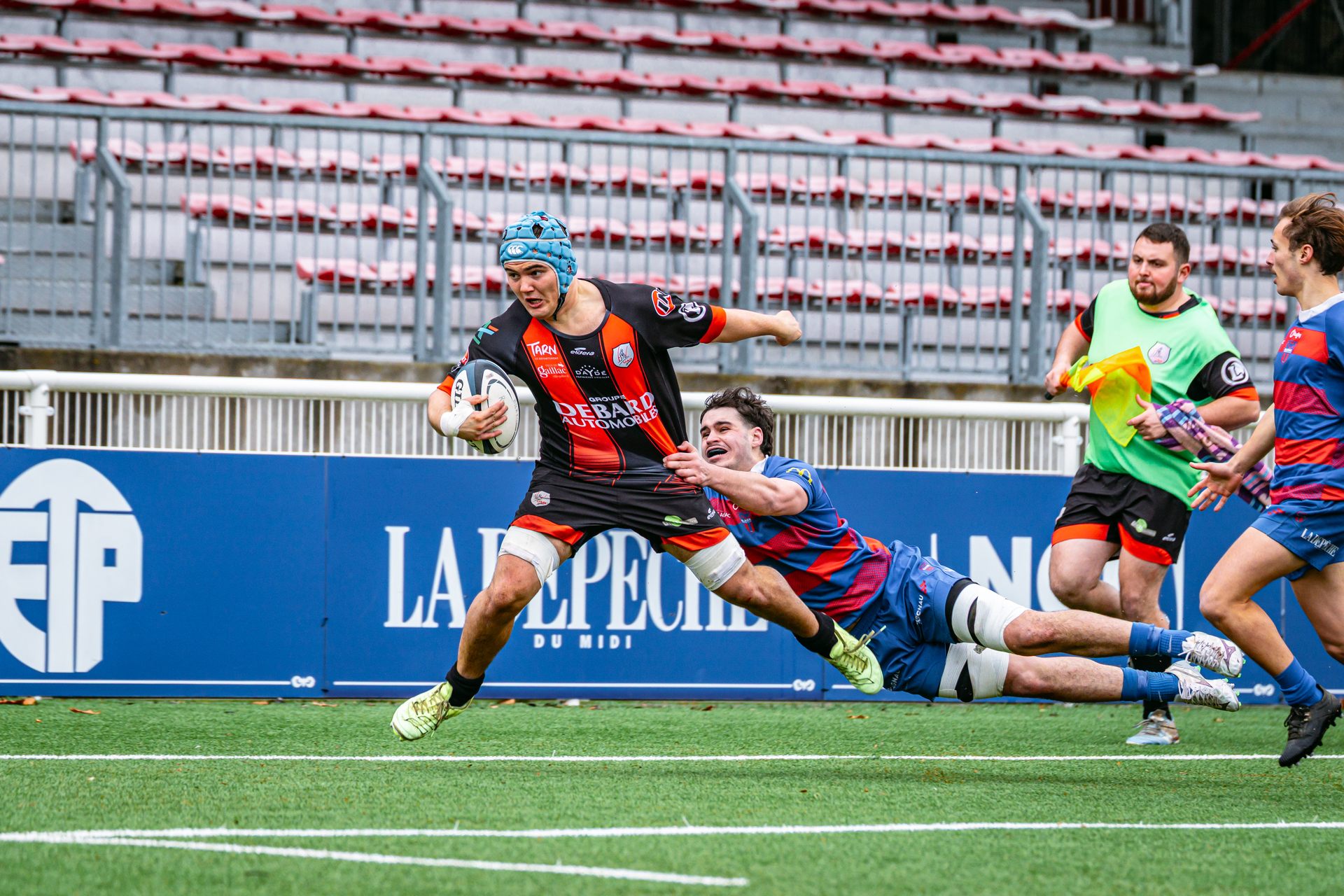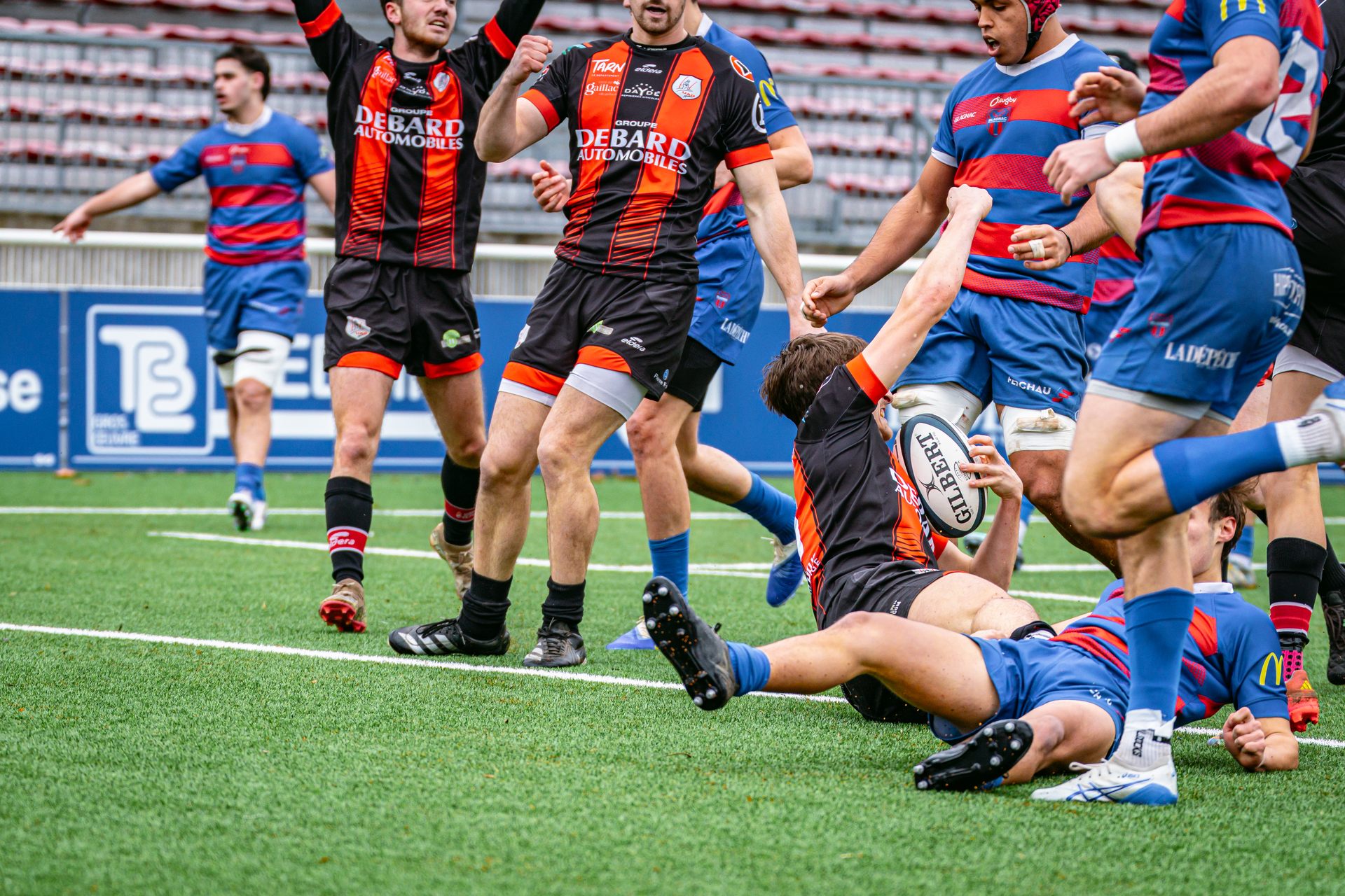 La réaction gaillacoise est immédiate. Sur un ballon de récupération, Tilian Escaffit transperce la défense et file le long de la touche pour égaliser (7-7, 21’).