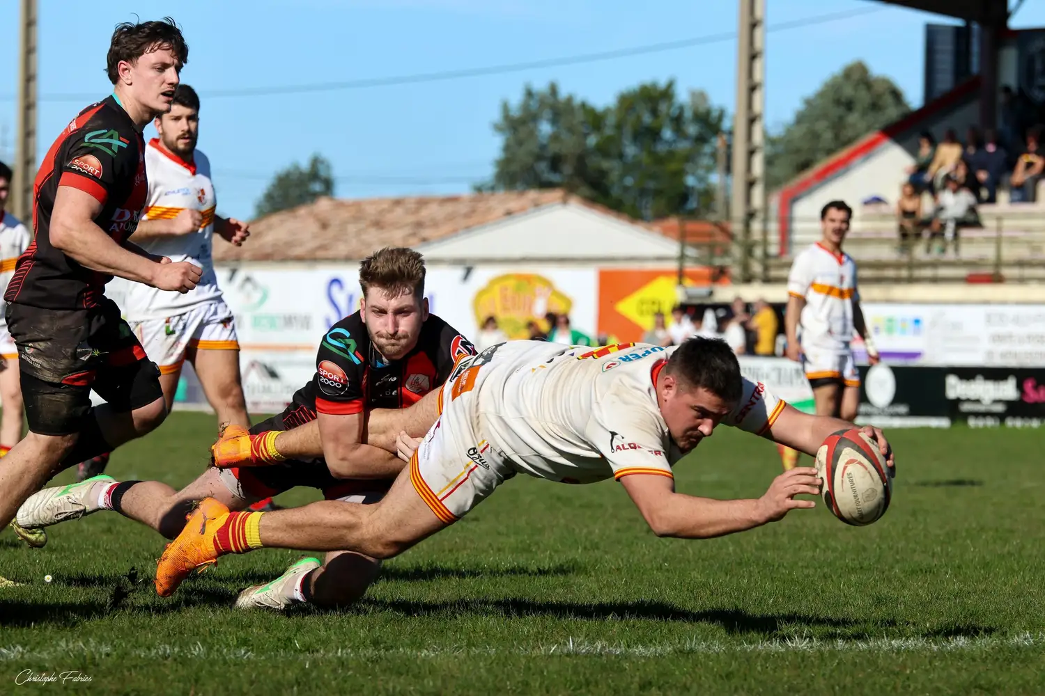 Sur le renvoi suivant, nos joueurs enchaînent. Coup de pied rasant, Victor Renaud plonge le premier, Teddy Goze transforme (34-27, 69’).