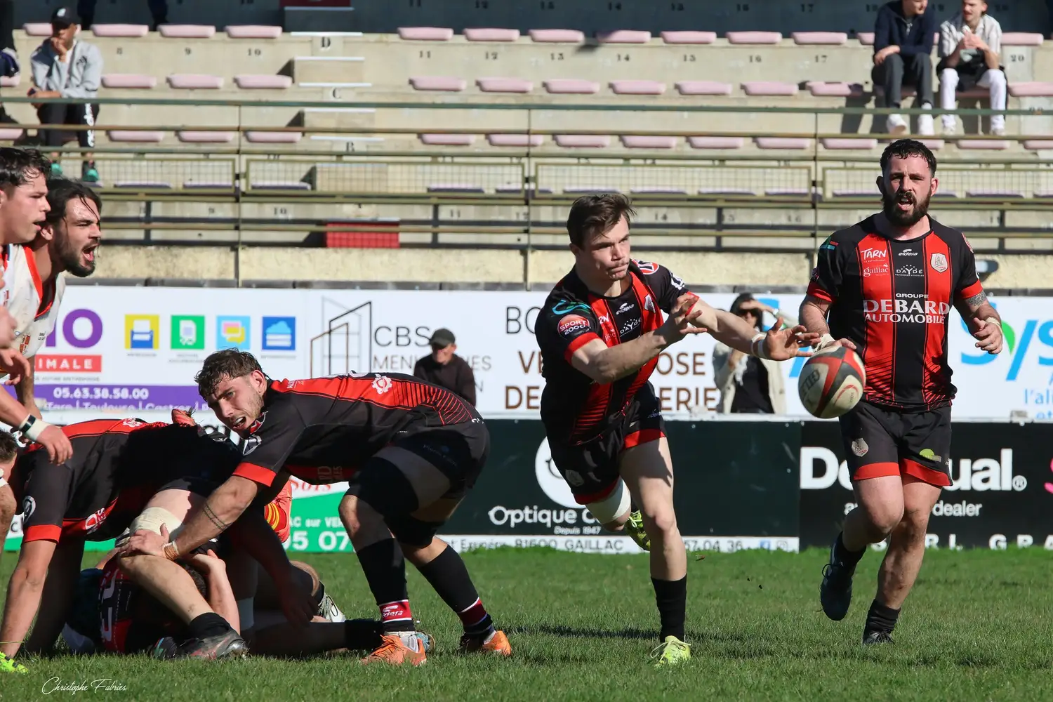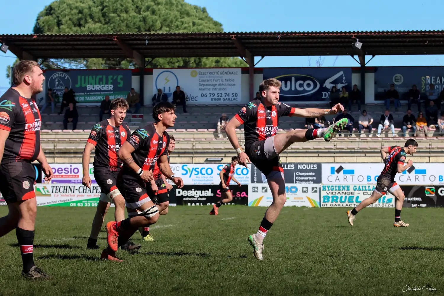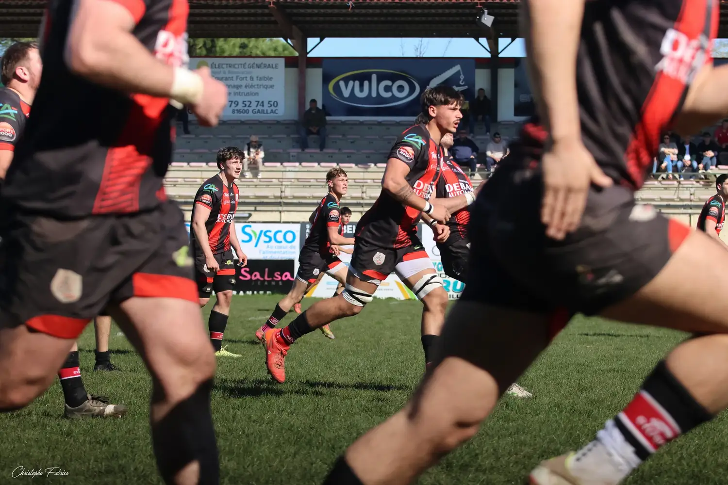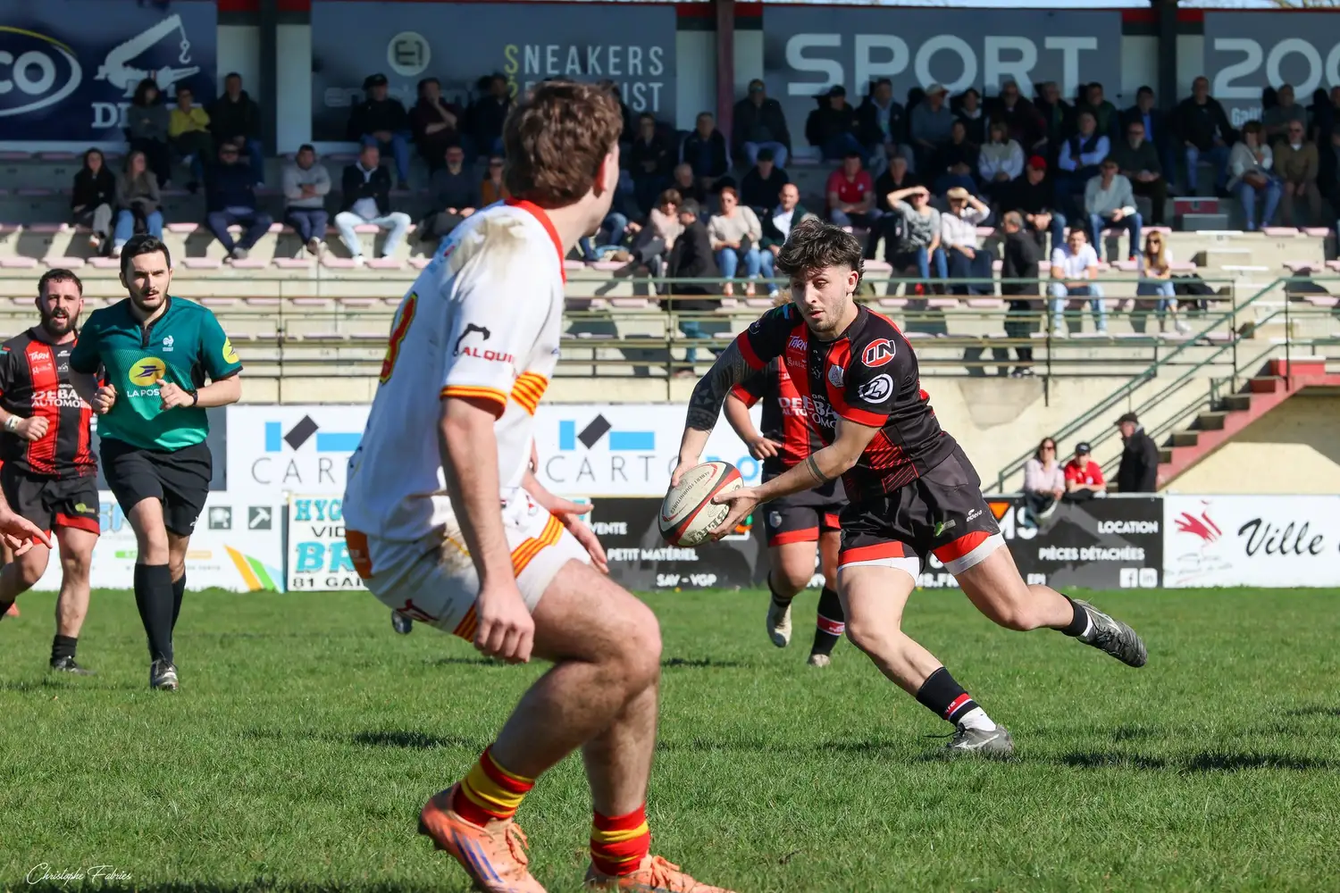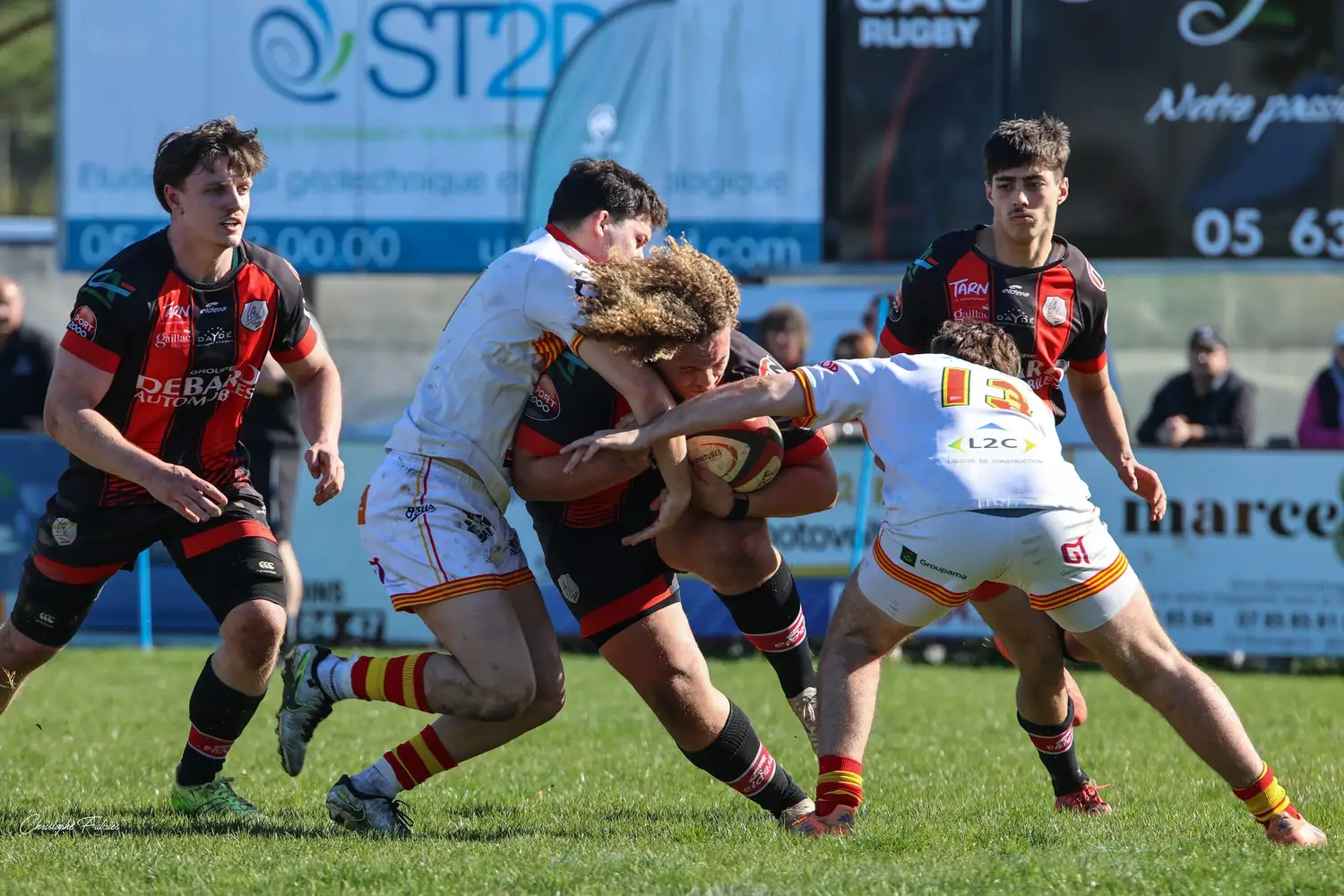 À 14h, nos espoirs lançaient l’après-midi. Et quelle première mi-temps ! Face à des Gersois étonnamment peu à l’aise, nos jeunes rouges et noirs mettent rapidement la main sur le ballon. La domination territoriale est nette. Les visiteurs sont poussés à la faute et nos Gaillacois convertissent trois pénalités.