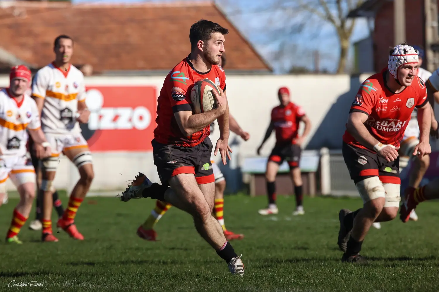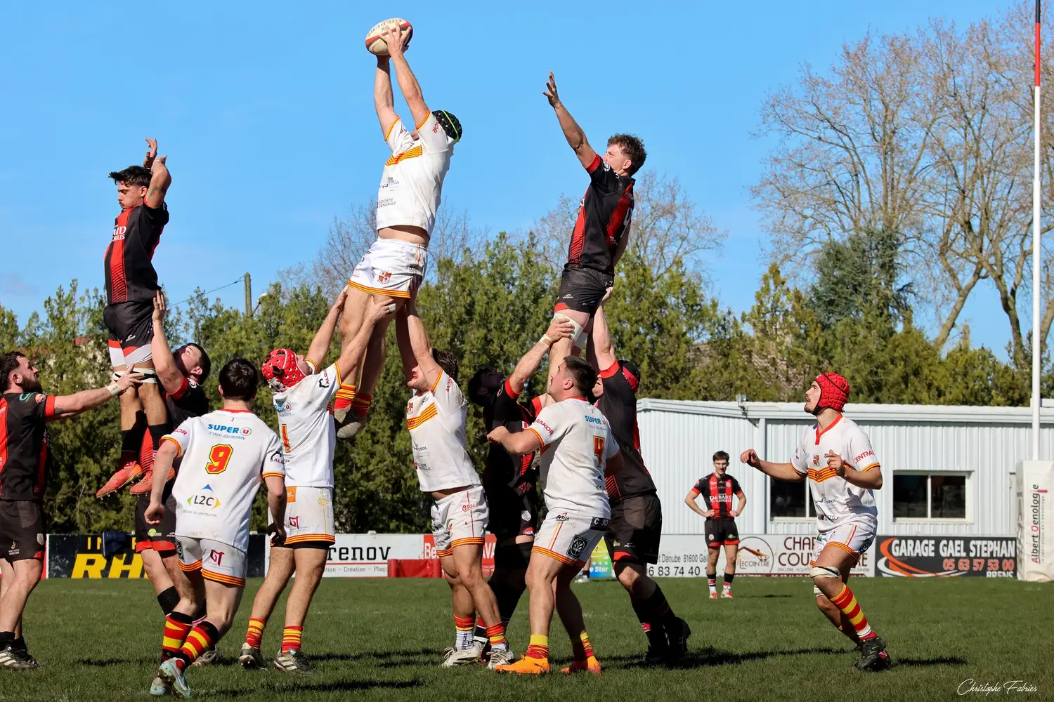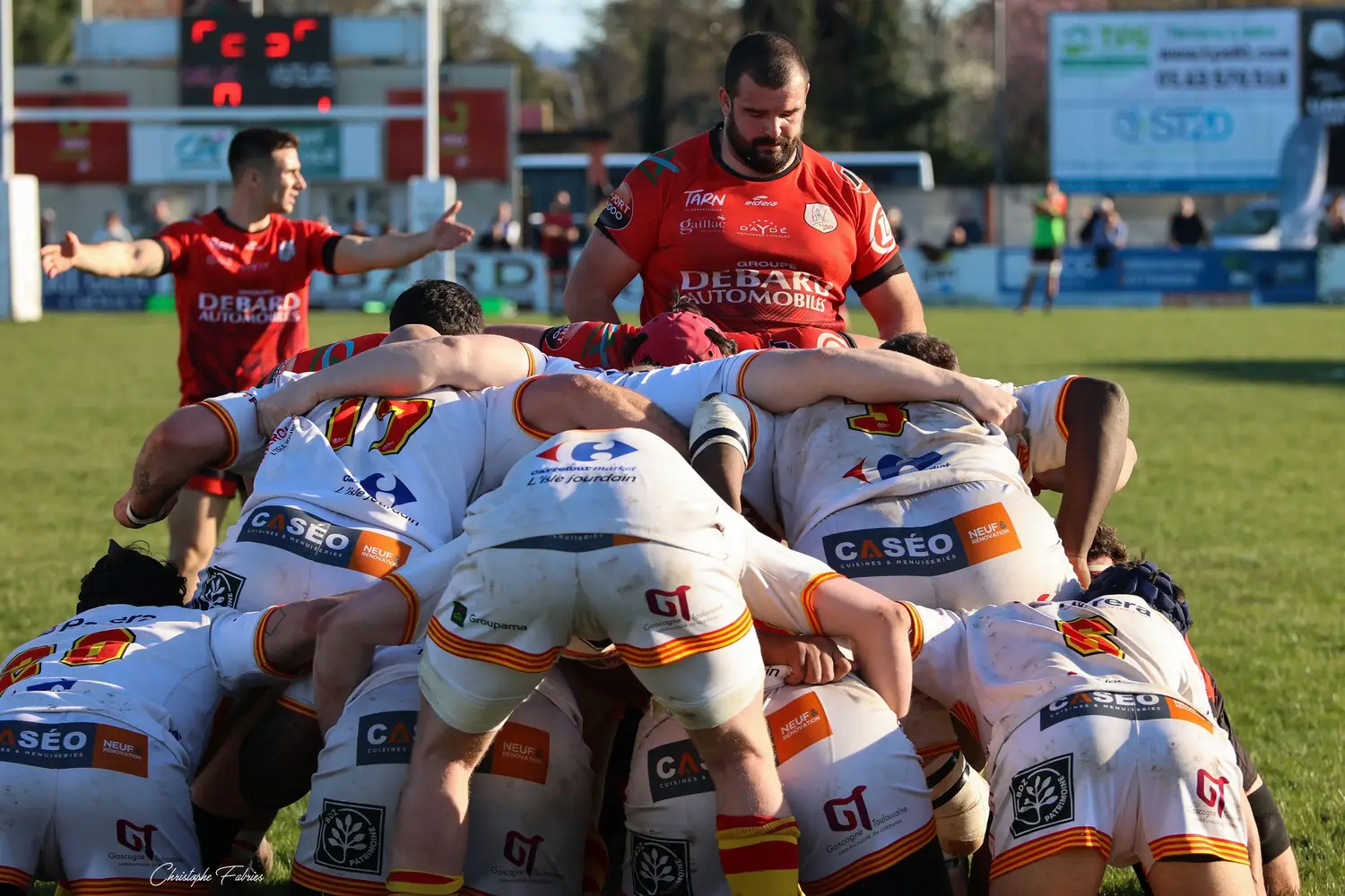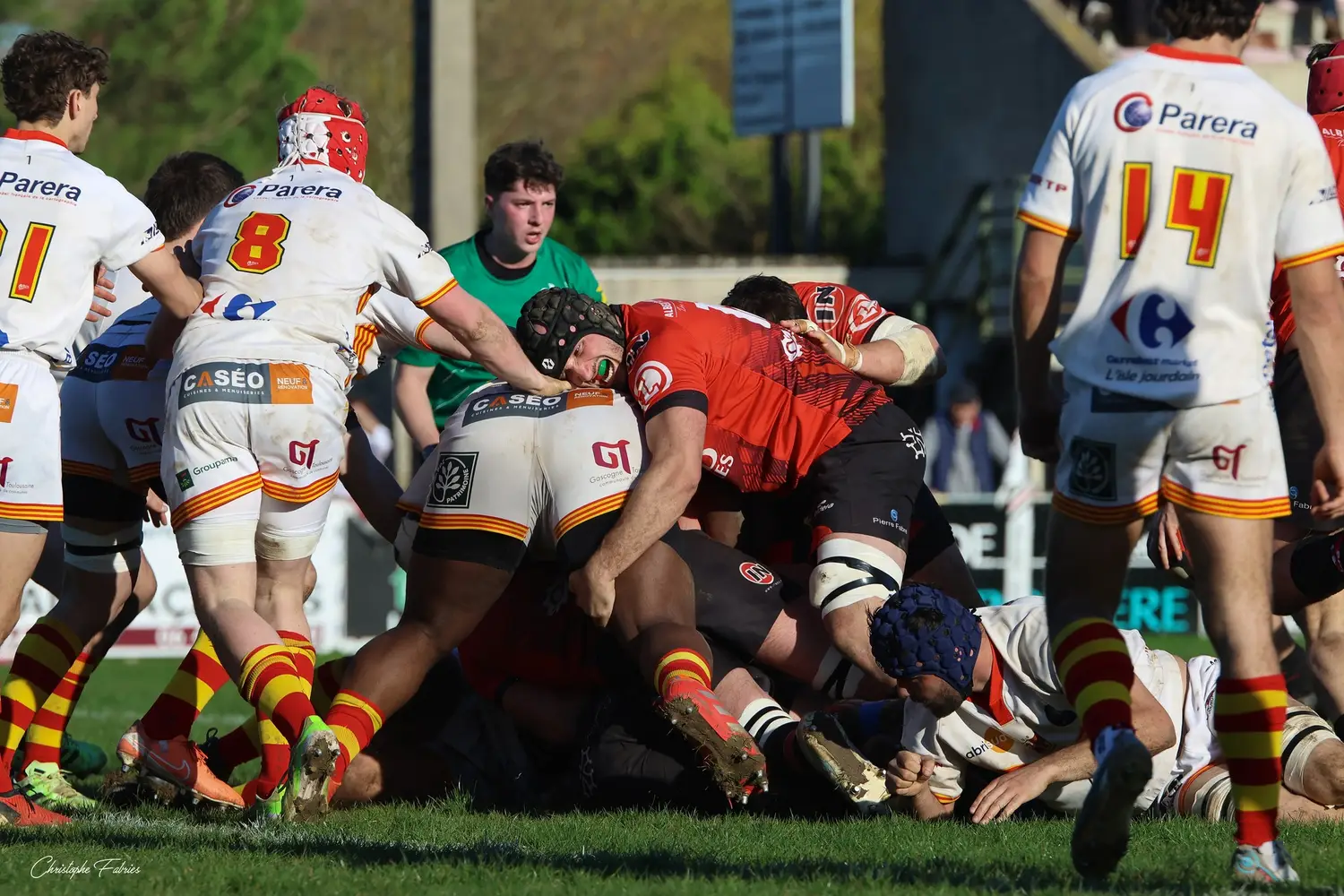 À 14h, nos espoirs lançaient l’après-midi. Et quelle première mi-temps ! Face à des Gersois étonnamment peu à l’aise, nos jeunes rouges et noirs mettent rapidement la main sur le ballon. La domination territoriale est nette. Les visiteurs sont poussés à la faute et nos Gaillacois convertissent trois pénalités.