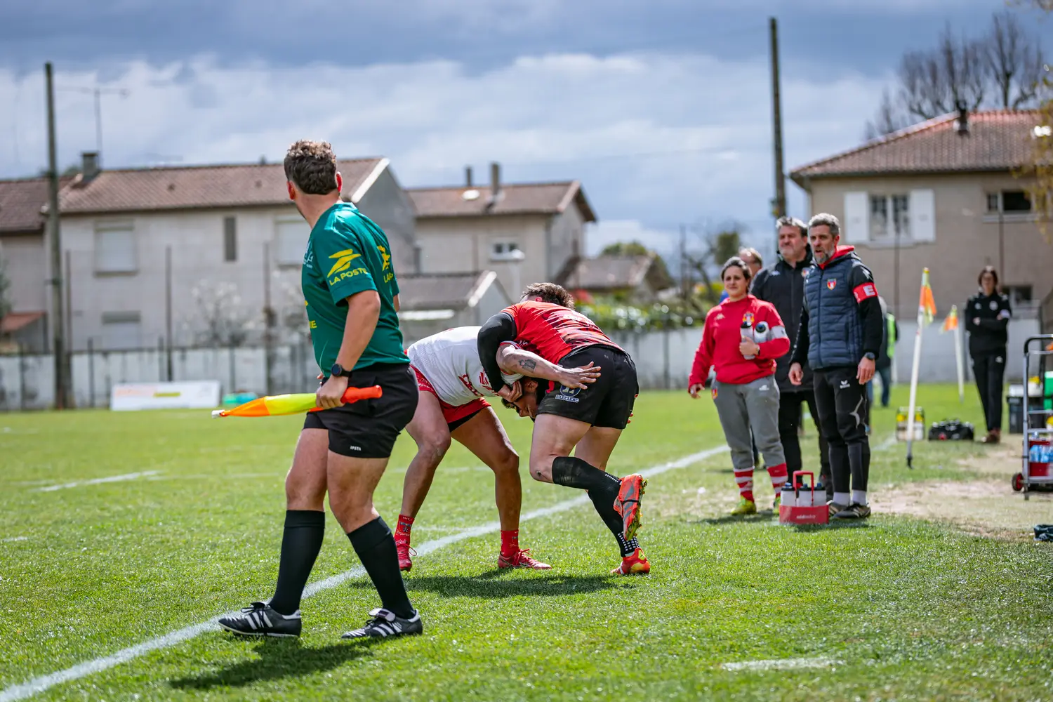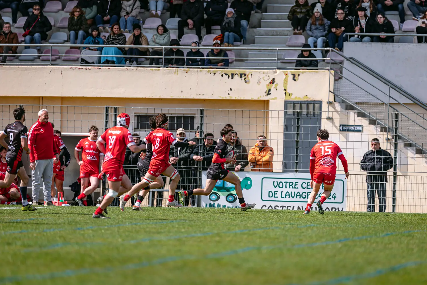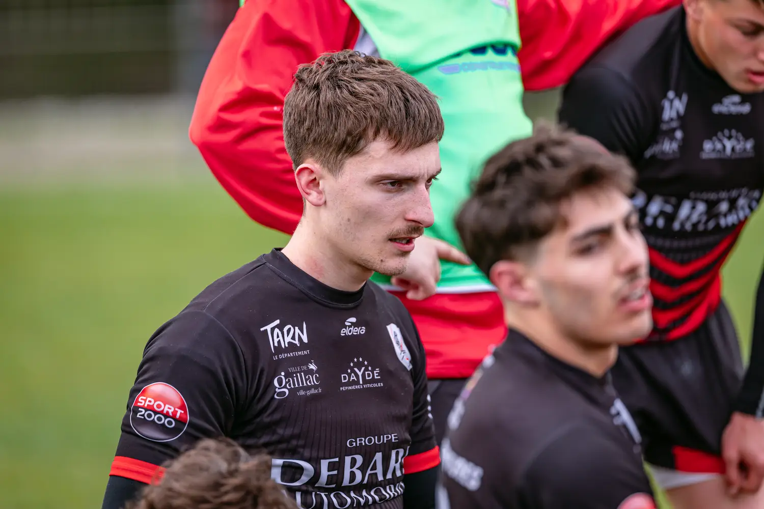 Le début de match est compliqué avec un carton jaune dès la 13e minute, mais malgré cela, les Gaillacois trouvent les ressources pour inscrire le premier essai à la 23e minute par l’intermédiaire de Jean Gaudin.