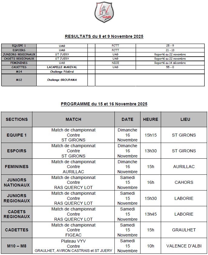 Programme du week-end du 15 et 16 novembre à l’UAG Rugby