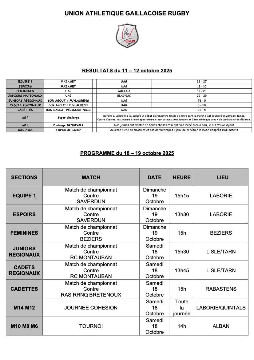Mais pas de répit ! Un nouveau week-end chargé attend la grande famille de l’UAG. Des plus jeunes aux Séniors, toutes nos équipes sont sur le pont avec, en point d’orgue, un grand dimanche à Laborie pour la réception de Saverdun.