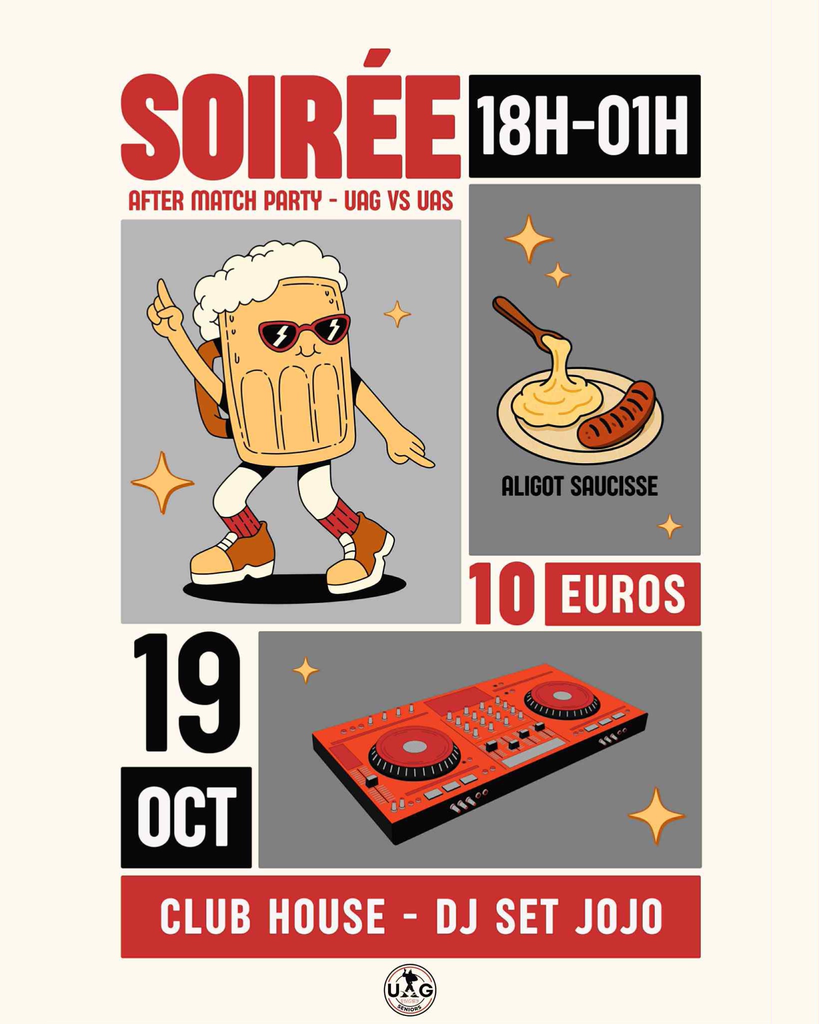L’Association des joueurs de l’UAG organise une soirée aligot-saucisse (10 €) animée par DJ Jojo, pour fêter ensemble cette fin de deuxième bloc dans la convivialité Gaillacoise !