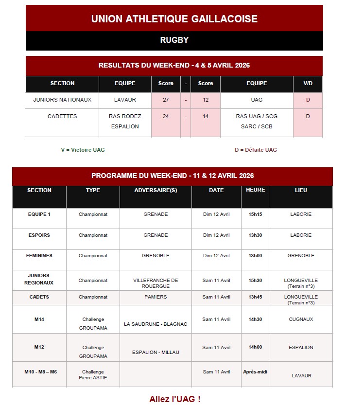 Programme week-end Pâques UAG Rugby : nos juniors en action